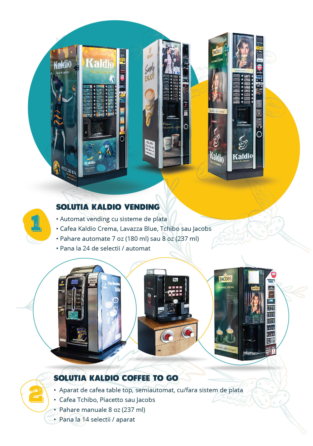 Kaldio Coffee propune in acest moment cea mai divesificata oferta de cafea din piata, cuprinzand 6 marci de cafea (Kaldio, Lavazza, Tchibo, Piacetto, Jacobs, Costa) si 4 solutii de vanzare: Automate Kaldio Vending, Coffee To Go, Coffee Corner Clasic si Coffee Corner Premium.